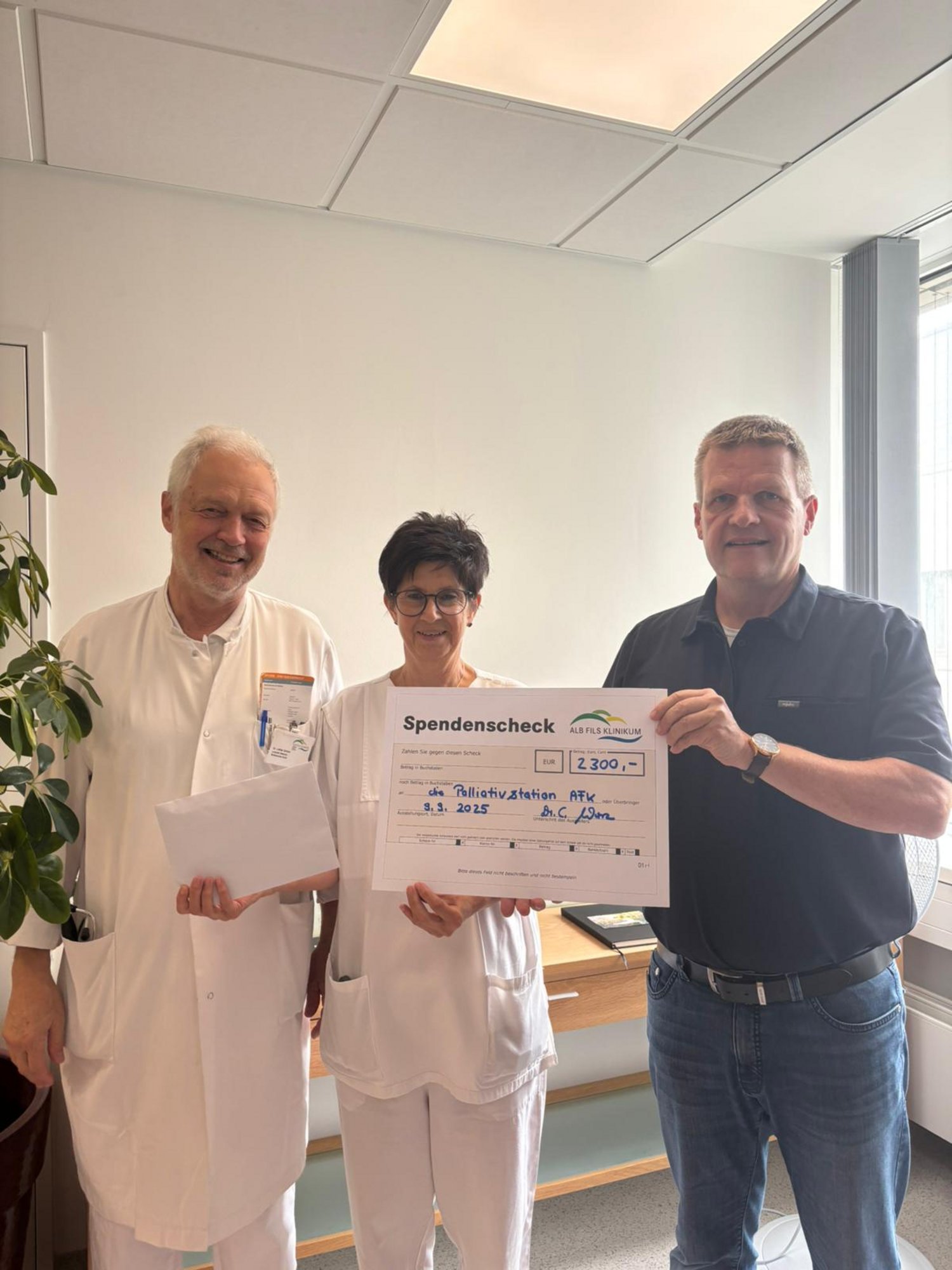 Eine besondere Geste der Dankbarkeit: Dr. med. Carsten Würz, ehemals Leitender Oberarzt an der Helfenstein Klinik in Geislingen und jetzt hausärztlich tätiger Internist in Süßen, hat der Palliativstation des ALB FILS KLINIKUMS eine Spende in Höhe von 2.300 Euro übergeben. Entgegengenommen wurde die Spende von Frau Kümmel, pflegerische Leitung, und Dr. med. Grimm, leitender Oberarzt der Palliativstation.