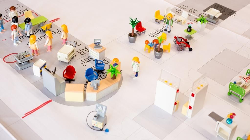 Anhand von Ablaufsimulationen werden die typischen Konstellationen der Patientenversorgung durchgespielt: Die Grundstruktur der künftigen Pflegestation wurde beispielsweise im Maßstab 1:25 mit dem Klinikpersonal getestet und immer weiter optimiert. In einer Fabrikhalle wurden zudem Teile einer Station im Originalmaßstab nachgebaut und ebenfalls die Abläufe an die Anforderungen angepasst.