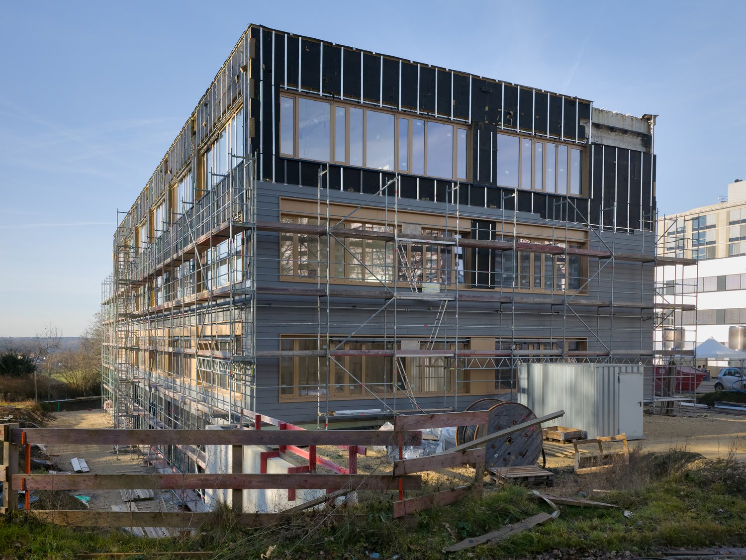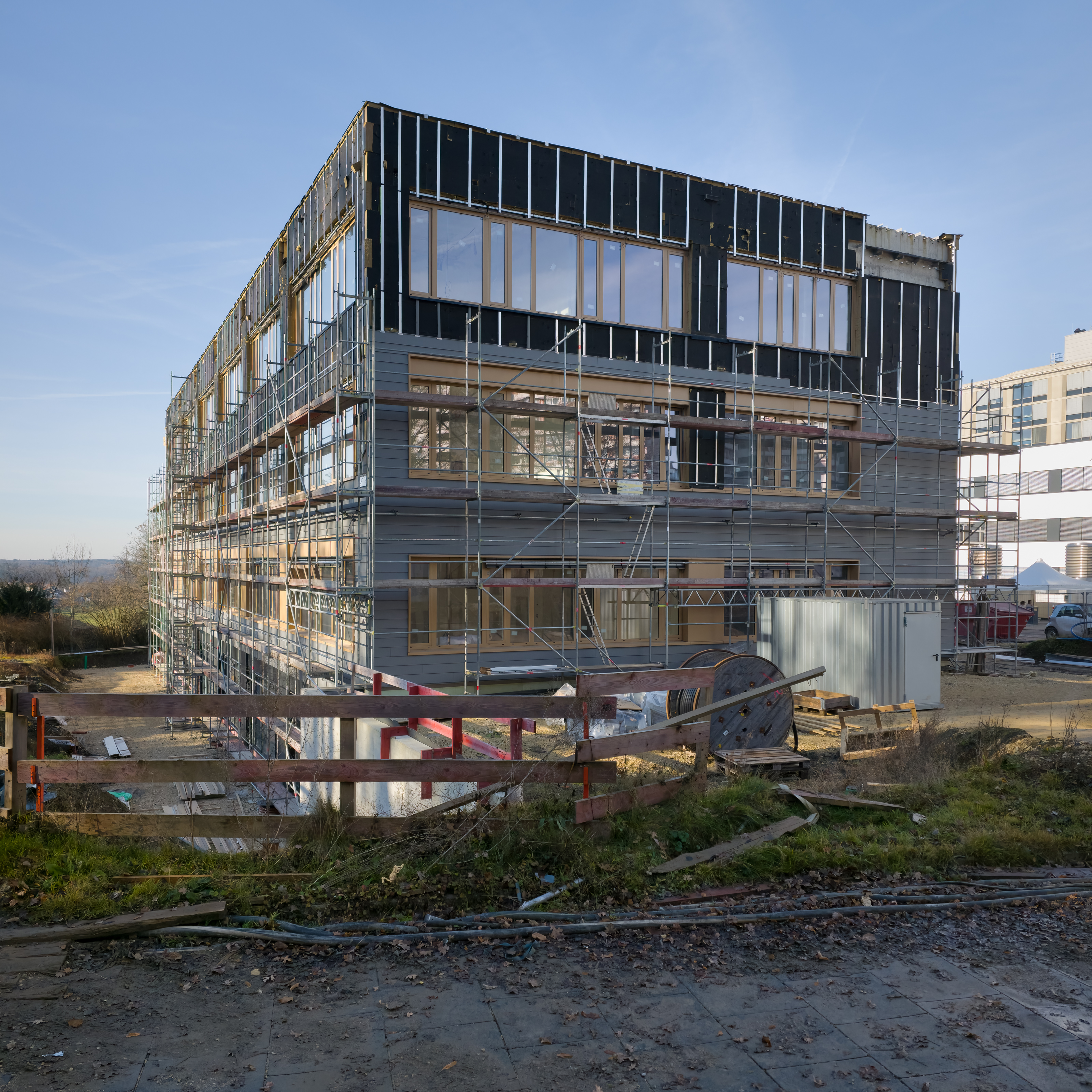 Rund vier Monate nach unserem letzten Bericht macht das neue Bildungszentrum große Fortschritte: Der Innenausbau schreitet zügig voran, die Fassade nimmt weiter Gestalt an und die Dachbegrünung ist fertig gestellt.